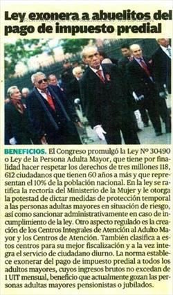 El experto indicó que ante la poquísima difusión de la ley 30490, los municipios continúan cobrando impuesto predial a las personas de 60 años a más, lo cual viola flagrantemente la norma, sin contar que los someten a cobranzas coactivas a sabiendas de la norma existente impuesto predial. Así es existen beneficios para toda persona pensionista en nuestra sociedad, es decir nuestros amigos jubilados estan exonerados del pago del impuesto predial, dispuesto por la ley de tributación municipal o decreto ley 776 de 1994.